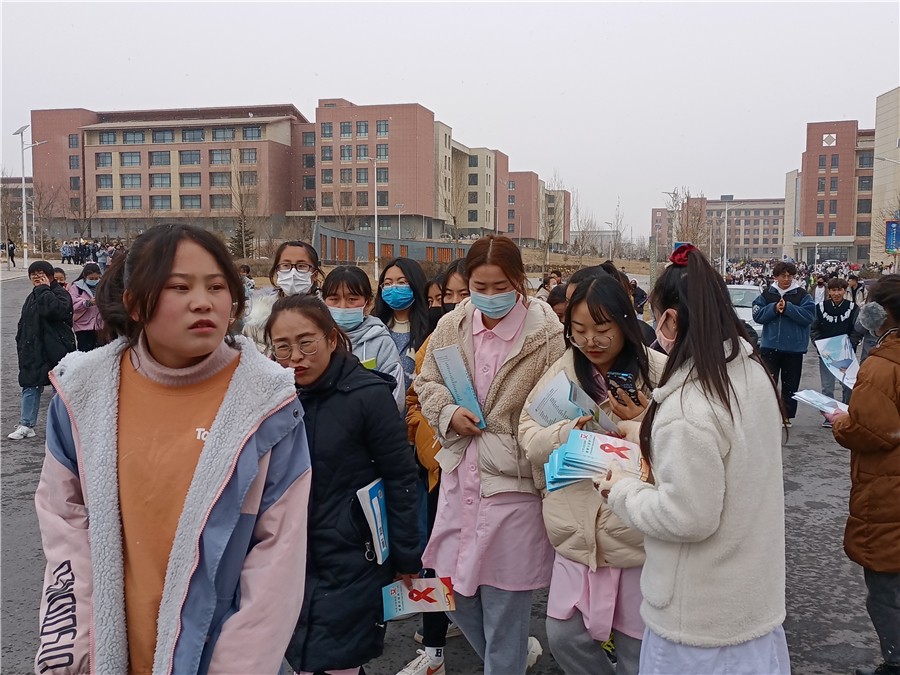 2020年12月1日,是第33个“世界艾滋病日”,我国的宣传活动主题是“携手防疫抗艾,共担健康责任”。为提高全校师生艾滋病基本知识水平,增强自我防护能力,学校附属医院在12月1日举办以“知艾防艾,共享健康”为主题的宣传系列活动,参加本次活动的有校领导、天使爱心社社员、青年志愿者及全校师生。