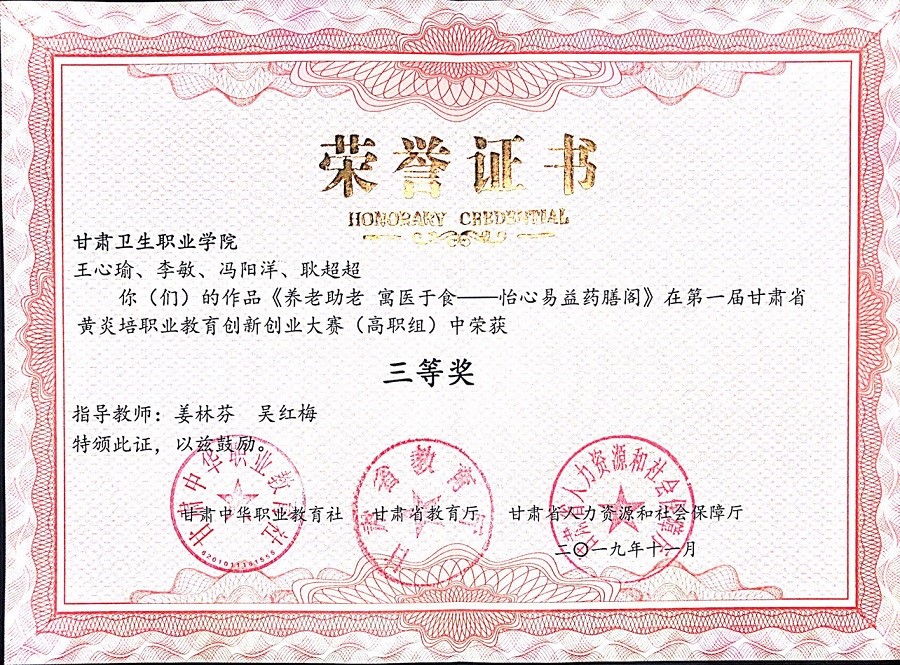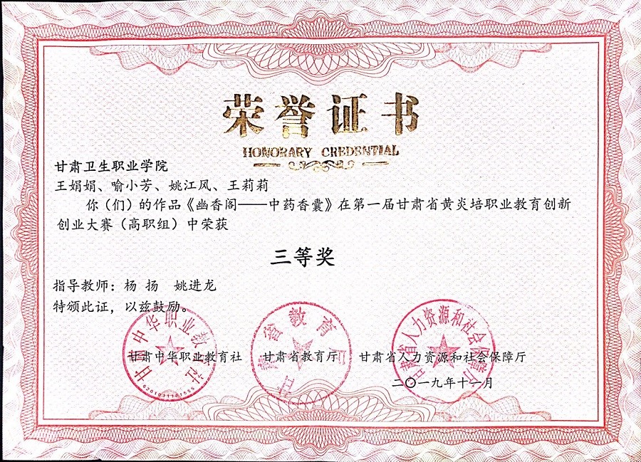 为深入贯彻落实国务院《关于大力推进大众创业万众创新若干政策措施的意见》和《国家职业教育改革实施方案》精神,进一步推动“大众创业、万众创新”,促进职业院校创新创业教育发展,11月7日至9日,由甘肃中华职业教育社、甘肃省教育厅、甘肃省人力资源和社会保障厅主办,兰州资源环境职业技术学院承办的第一届甘肃省黄炎培职业教育创新创业大赛在兰州资源环境职业技术学院举行。本次大赛采取专家初评、现场决赛的竞赛形式。经校内初审、校外创业专家组评审,学校有两个项目入围了现场决赛答辩阶段。最终,红足1—世官网王心瑜团队的“养老助老,寓医于食——怡心易益药膳阁”项目和王娟娟团队的“幽香阁——中药香囊”项目获得大赛高职组三等奖。